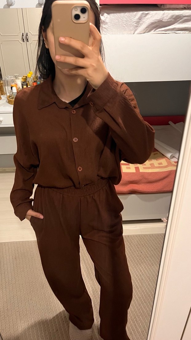 Kadınlar için kahverengi keten takımı, düğmeli ve kesik yaka detaylıdır. Rahat kesim, uzun kollu ve günlük kullanıma uygundur.