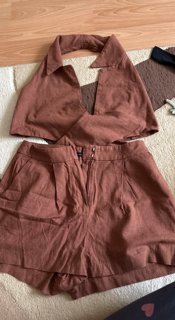 Kahverengi keten kumaştan, V yakalı, kolsuz, bol kesim ve mini boy tulum. Bohem tarzı ve rahat şıklık sunar, günlük kullanım için uygundur.