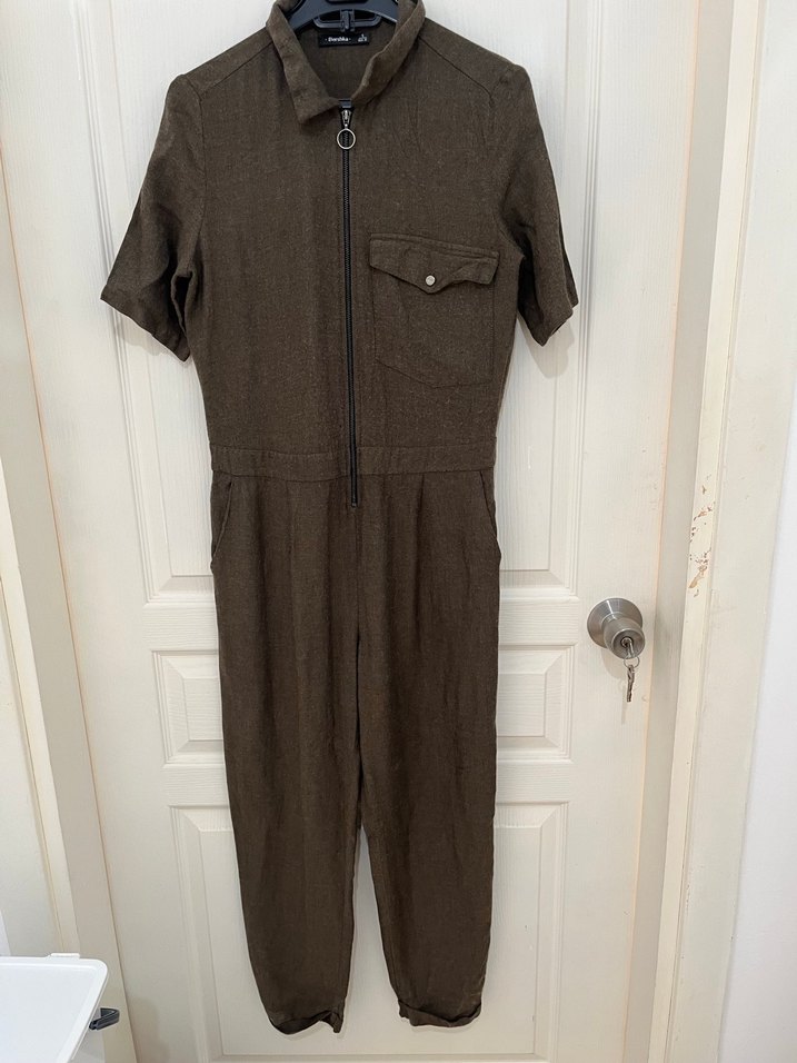 Kahverengi tulum, kısa kollu, fermuarlı, göğüs cebi ve kesik yaka detaylarıyla günlük kullanıma uygun midi boy ve regular fit.