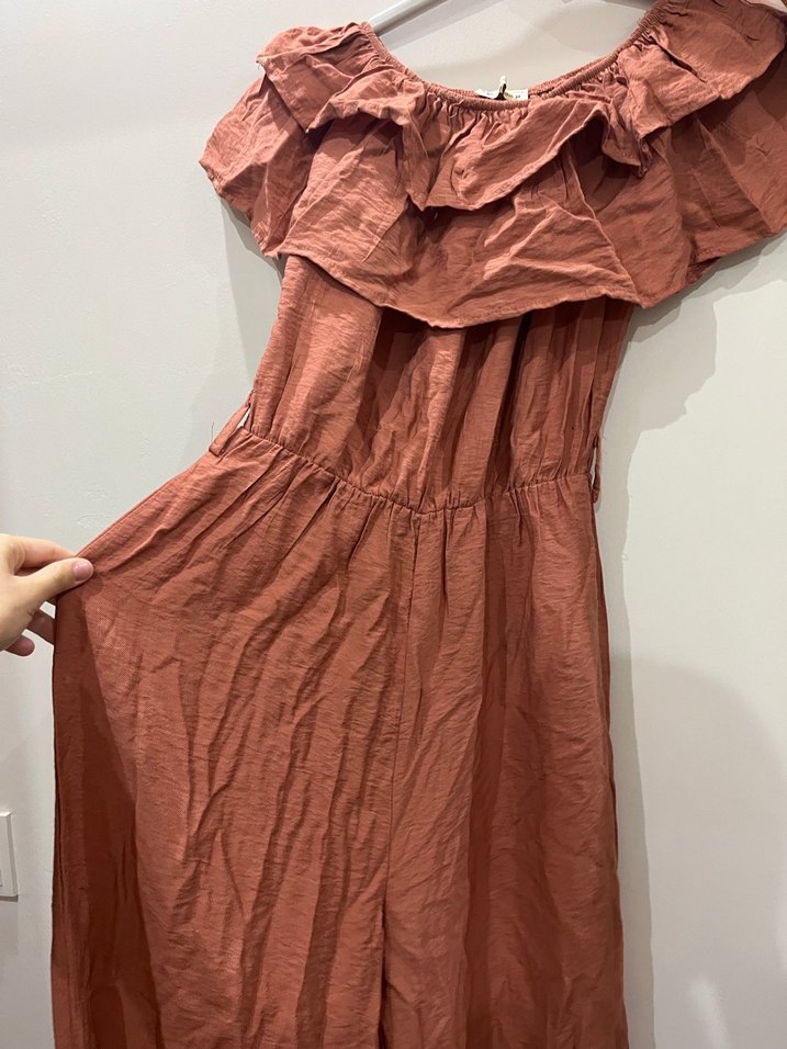 Kadın kahverengi keten uzun tulum, askısız yaka ve fırfır detaylıdır. Hafif ve parlak kumaştan, bol kesim ve bohem tarzındadır. Kolsuz ve desensizdir, günlük kullanıma uygundur. 2-3 kez giyildi ütü lazım