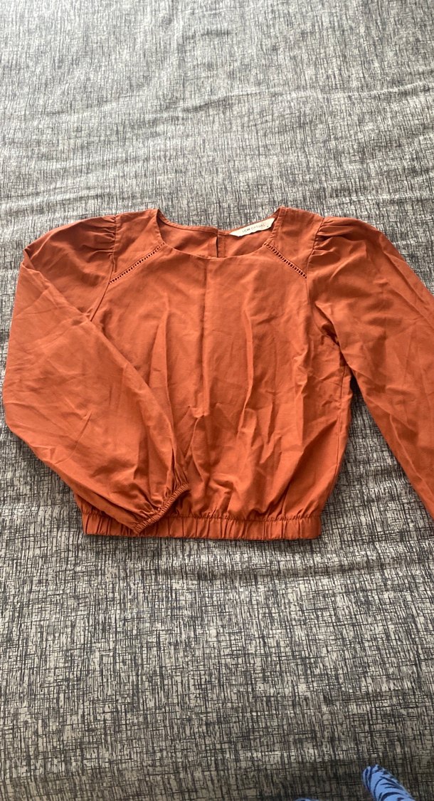 Kadınlar için bol kesim, uzun kollu ve yuvarlak yakalı kahverengi, parlak keten bluz. Normal midi uzunluğunda, sade ve rahat tarzda, günlük kullanıma uygun. 1-2 kez giyildi