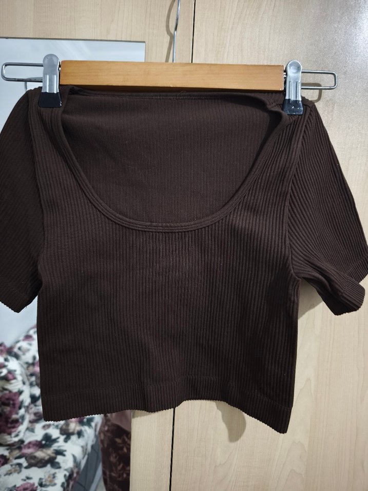 Kahverengi, kısa ve fitted crop top, yuvarlak yaka ve kısa kollu. Düz, minimalist tasarım, rahat sentetik kumaştan. üçünüde bu fiyata veriyorum