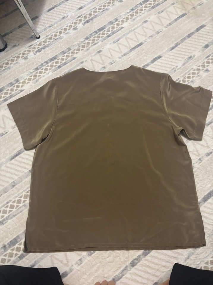 Kısa kollu, yuvarlak yaka ve salaş kesim kadın tişörtü. Kahverengi-gri tonlarında, ipeksi dokulu, rahat ve şık bir görünüm sunar.