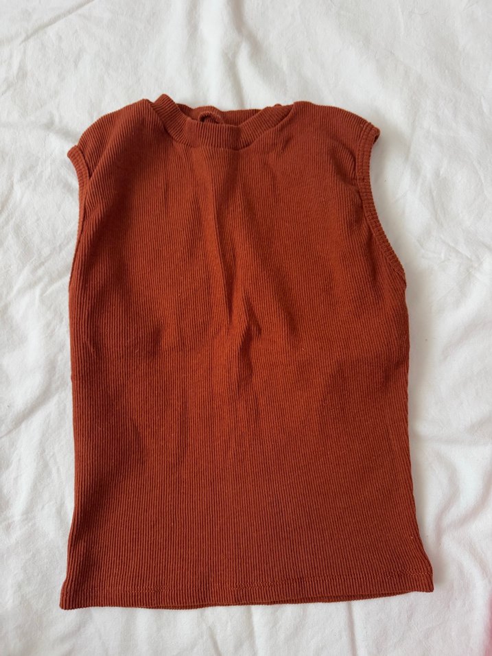 Yumuşak keten kumaştan, yüksek yakalı ve kolsuz, fitted kesime sahip kahverengi atlet. Düz ve desen içermeyen tasarımıyla rahat ve şık görünüm sunar.