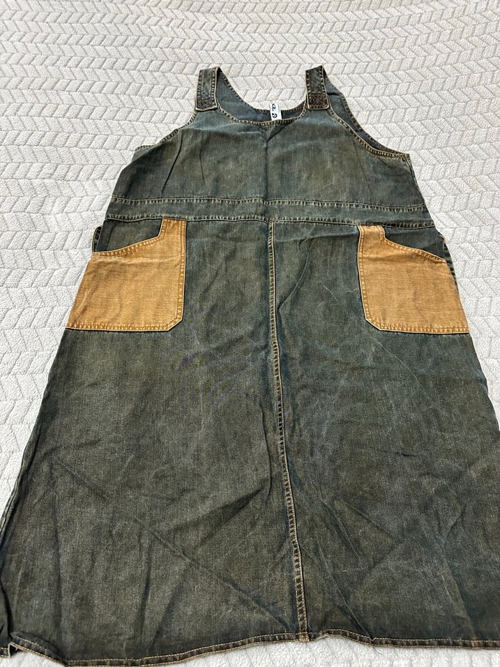 Koyu kahverengi kot kumaştan, askısız ve bol kesimli kadın hamile elbise . Büyük cepler ve kemerli, bohem tarz için uygun .