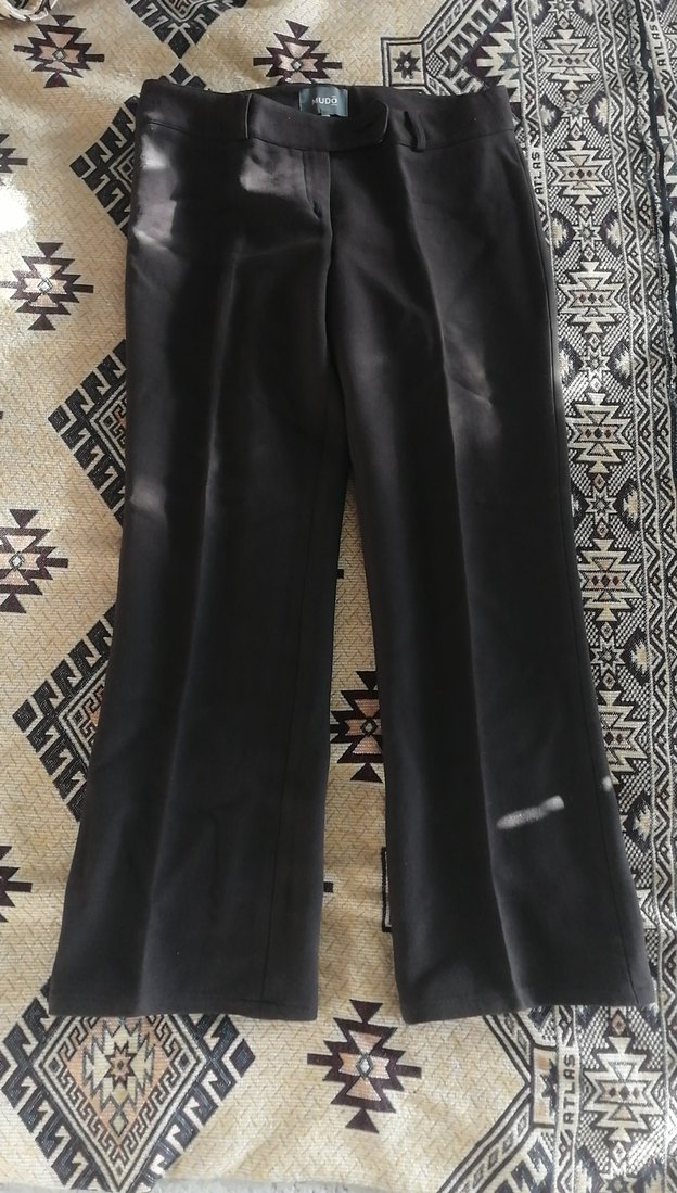 Kadınlar için kahverengi kumaş pantolon, normal boy midi kesim ve kemerli. Sentetik kumaştan üretilmiş, ofis ve günlük şıklık için uygun.