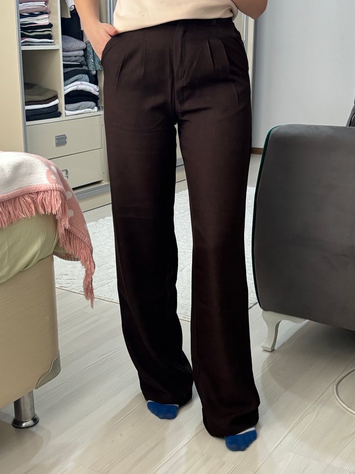 Kadın kahverengi kumaş pantolon, normal boyda, rahat kesim ve ipeksi dokuda. Ofis ve sokak stiline uygun, desen içermeyen şık ve rahat bir tasarım sunar.