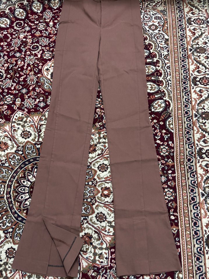 Kahverengi, uzun ve düz kesim kadın pantolonu. Sentetik kumaştan, bohem tarzı için uygun, günlük kullanıma ideal.