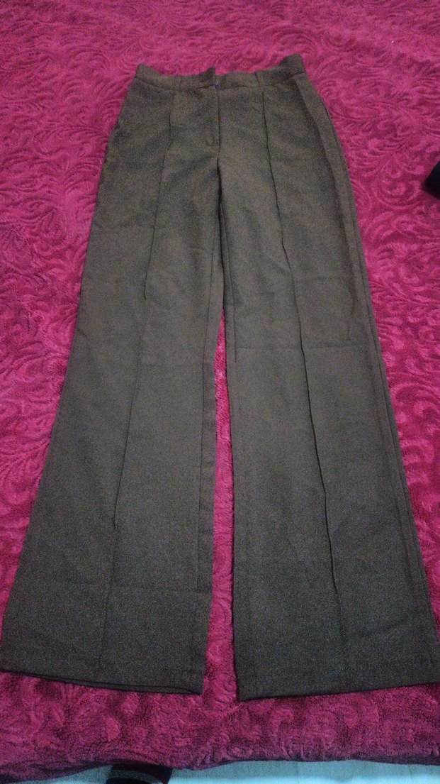 Kadınlar için kahverengi, pilili, düz desenli kumaş pantolon. Uzun boyda, sentetik malzemeden üretilmiş, ofis kullanımı için uygundur.hic giyilmedi etiketsiz ama sıfır ürün