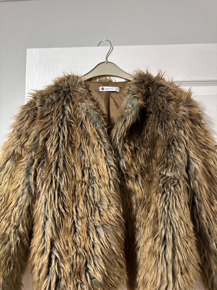 S/ m beden Bohem tarzda, kahverengi ve gri tonlarında suni kürk midi ceket. Notlu yaka, uzun kollu ve bol kesimdir, günlük kullanıma uygundur. 1 kere giyildi