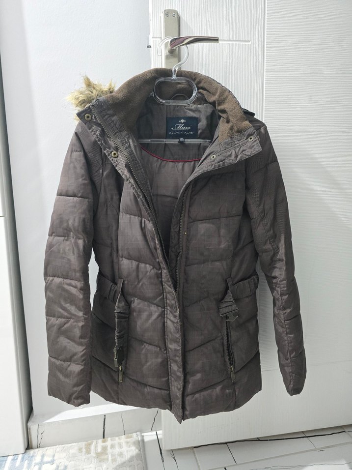 Kahverengi, kürklü detaylı kadın kışlık mont. Strappy kollu, notched lapel yakalı, midi boyda ve rahat kesim. Sokak stili için uygun, yumuşak ve sıcak kumaş.