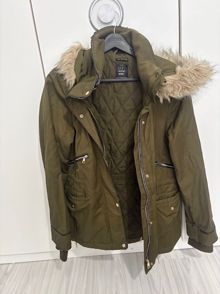 Kahverengi, kürklü kapüşonlu, normal boy midi kadın kaban. Notched lapel yakalı, askılı kollu, yumuşak ve sıcak kumaştan, trend günlük şıklık için uygun.
