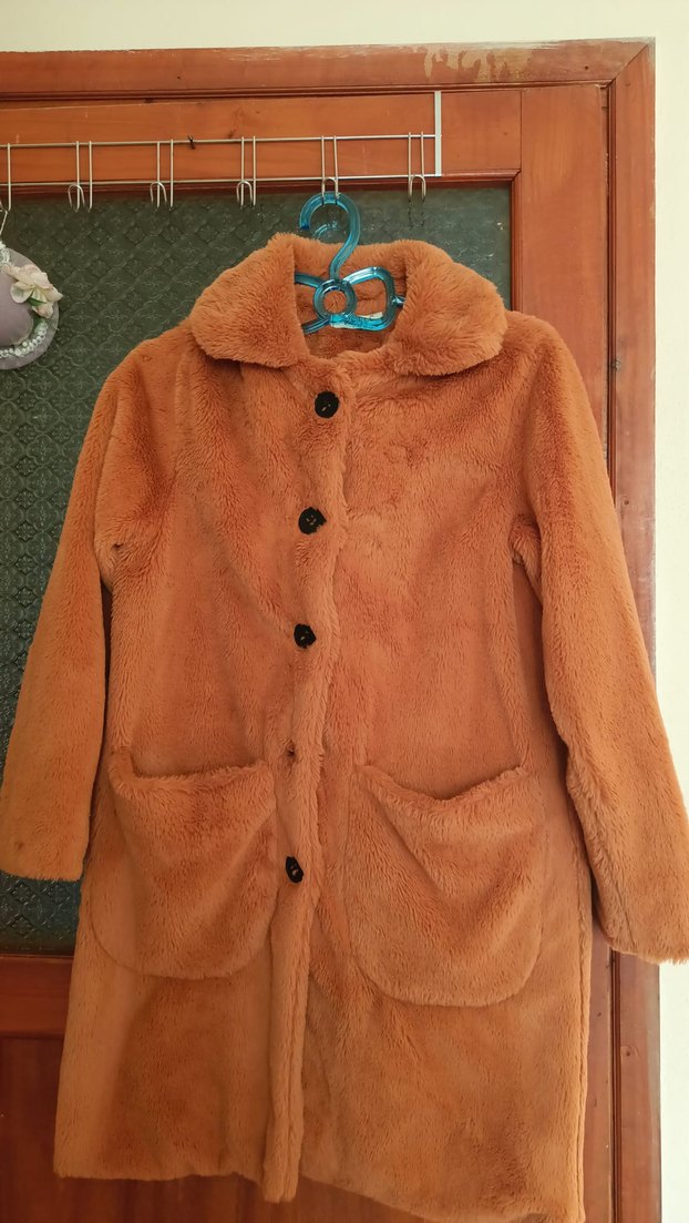 Kahverengi, kürklü detaylı midi kaban, yumuşak 1 2 kere kullanıldı temiz ürün