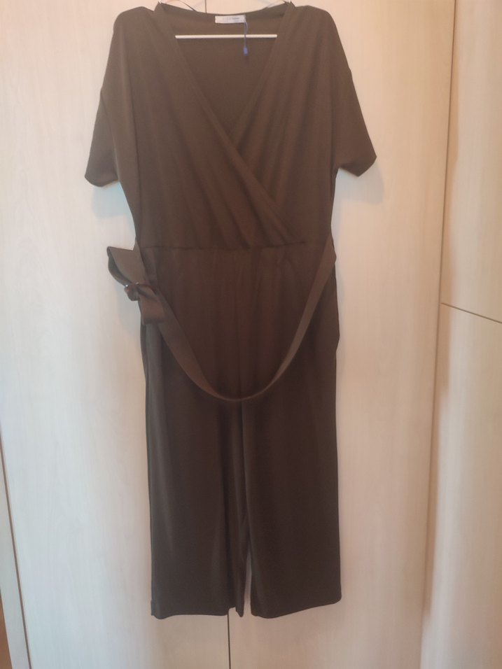 Kadın kahverengi uzun tulum, kuşaklı ve salaş kesimli, ince sentetik kumaştan ve askılı kollu. Minimalist tarzda, günlük kullanım için uygundur.