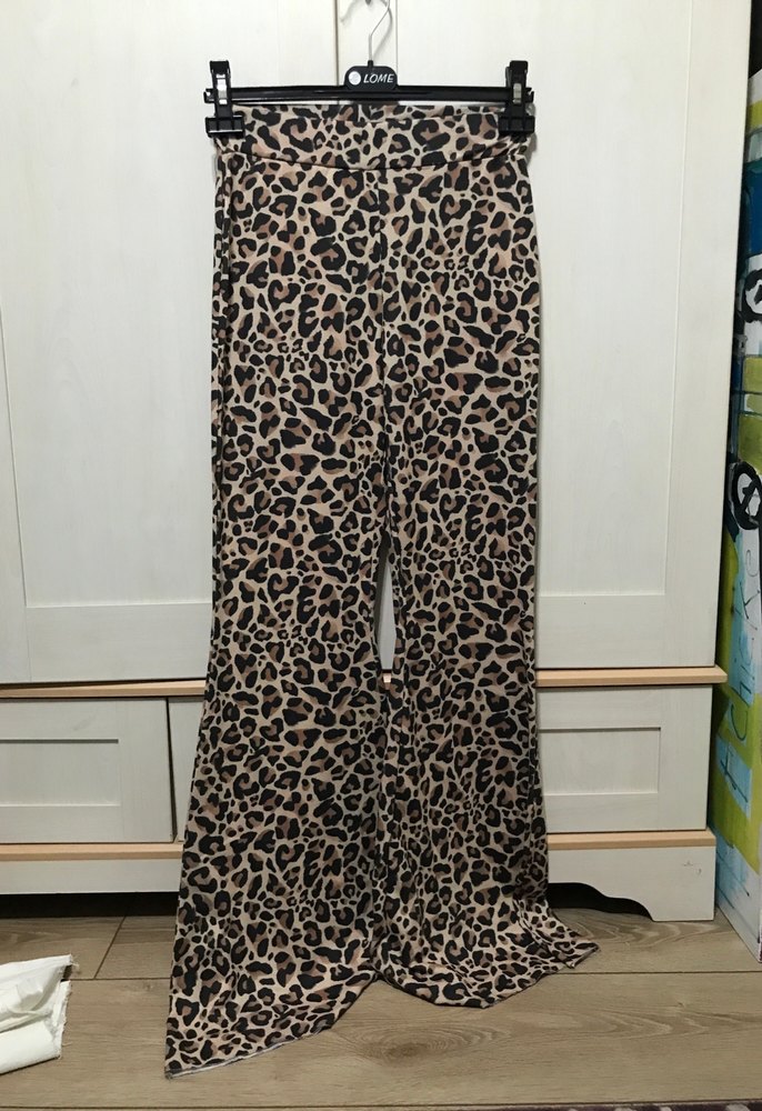 Yumuşak sentetik kumaştan, kahverengi leopar desenli, uzun ve bol kesim, kürk detaylı kadın pantolonu, bohem tarzı için uygundur.