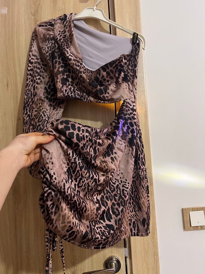 Kadın kahverengi leopar desenli, drapeli wrap modeli. Yumuşak sentetik kumaştan, sokak modasına uygun ve rahat bir tasarım.