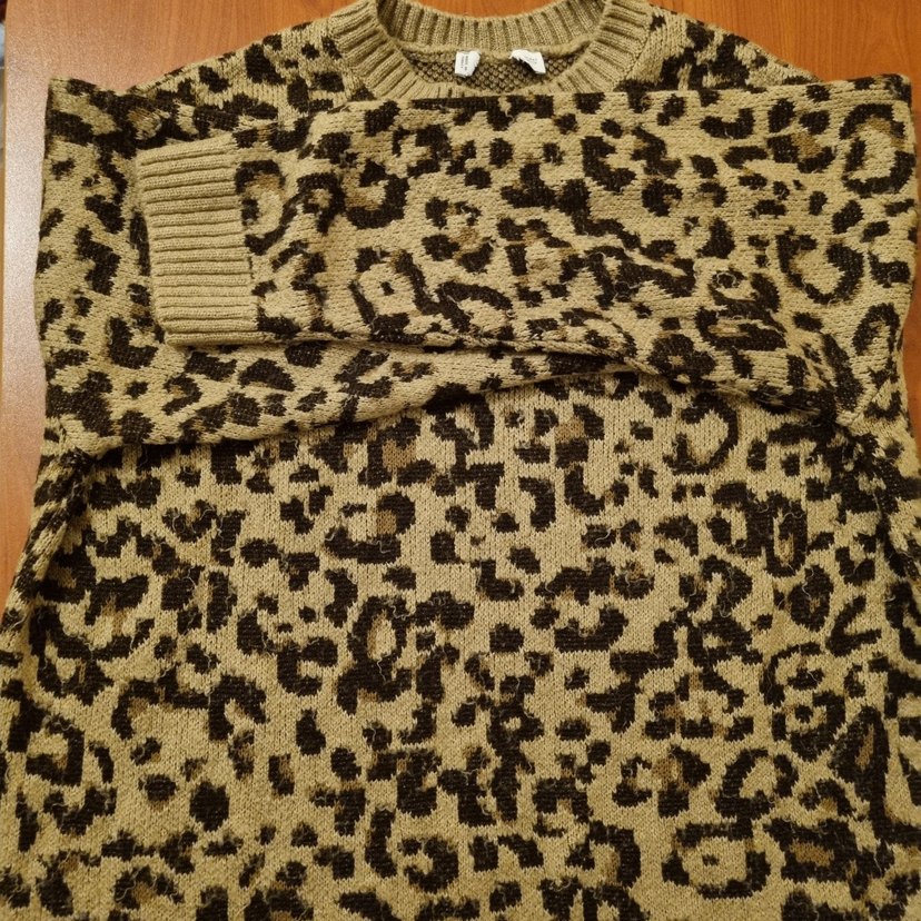 Kadınlar için kahverengi leopar desenli, örme dokulu, uzun kollu, yuvarlak yakalı ve bol kesim triko kazak. Dış mekan sokak giyimine uygundur.