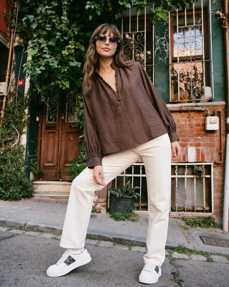Yumuşak pamuktan, parlak kahverengi, bol kesim bluz. Uzun kollu ve V yakalı, günlük kullanım için zahmetsiz şıklık sunar. S-M-L bedenleri mevcuttur