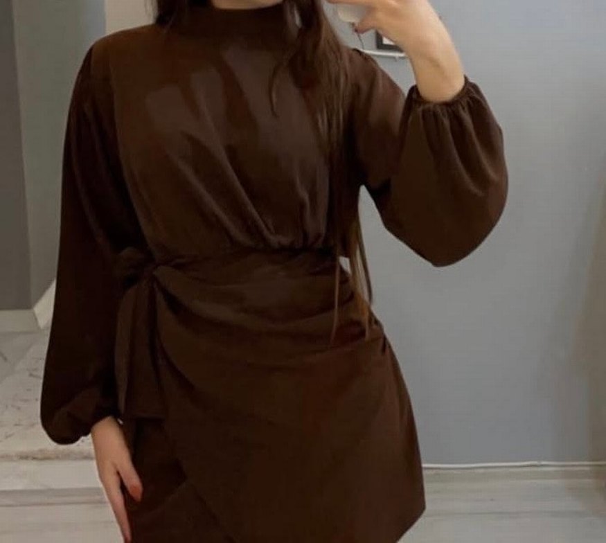Bu kahverengi midi elbise, yüksek yakalı ve uzun kollu, bol kesimli ve drapeli detaylı, ipeksi kumaştan yapılmıştır. Günlük kullanım için uygundur.