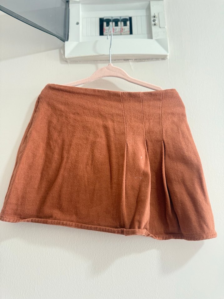Kahverengi midi keten etek, bol kesimi ve rahat dokusuyla zahmetsiz şıklık sunar. Düz ve desensiz tasarımı minimalist sokak stili için uygundur.