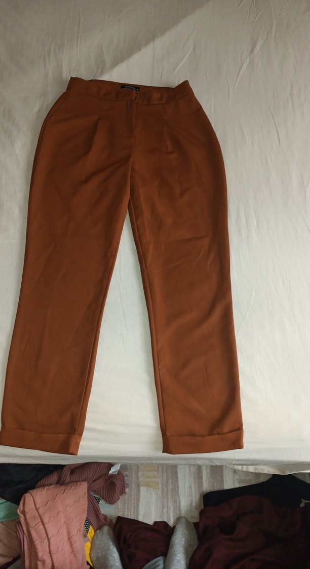 Kadınlar için kahverengi, midi uzunlukta, parlak görünümlü ve regular fit kumaş pantolon. Minimalist ve şık ofis stiline uygun.