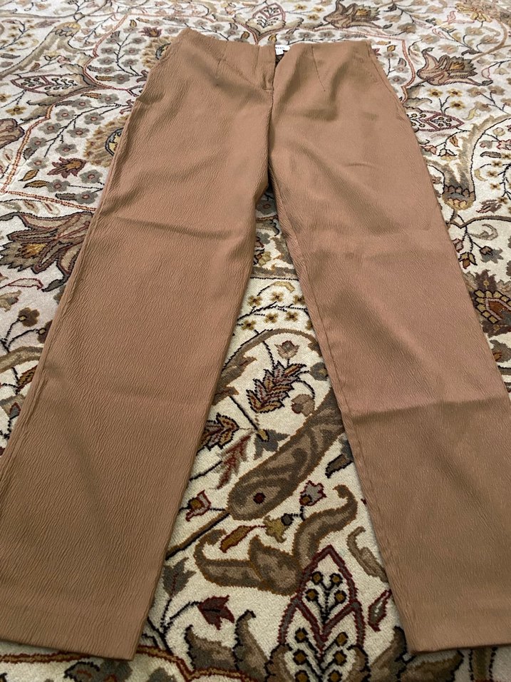Kahverengi, midi boy, düzenli kesim kumaş pantolon. Yumuşak sentetik kumaştan yapılmıştır. Günlük sokak modasına uygun, trend rahat stil.