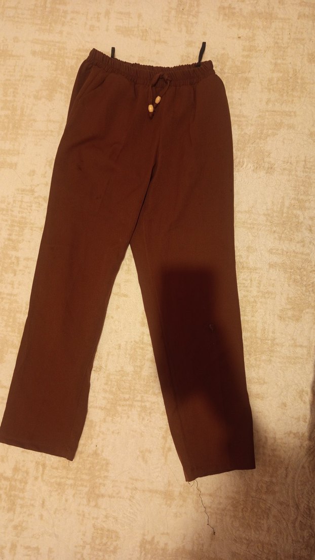 kalıbı biraz küçük 38 40 beden gibi ama etikette 42 yazıyor Kadın kahverengi kumaş pantolon, normal boy ve regular fit. İpeksi dokusu, desensiz ve minimalist tarzıyla günlük kullanıma uygun, rahat ve şık. Sokak modasına uyumlu.