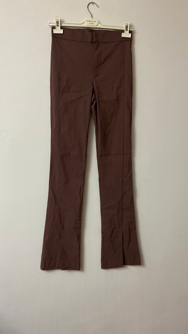 Kadın kahverengi midi uzunlukta, regular fit ve pilili detaylı, sentetik kumaştan yapılmış günlük kullanıma uygun minimalist tarzda pantolon.