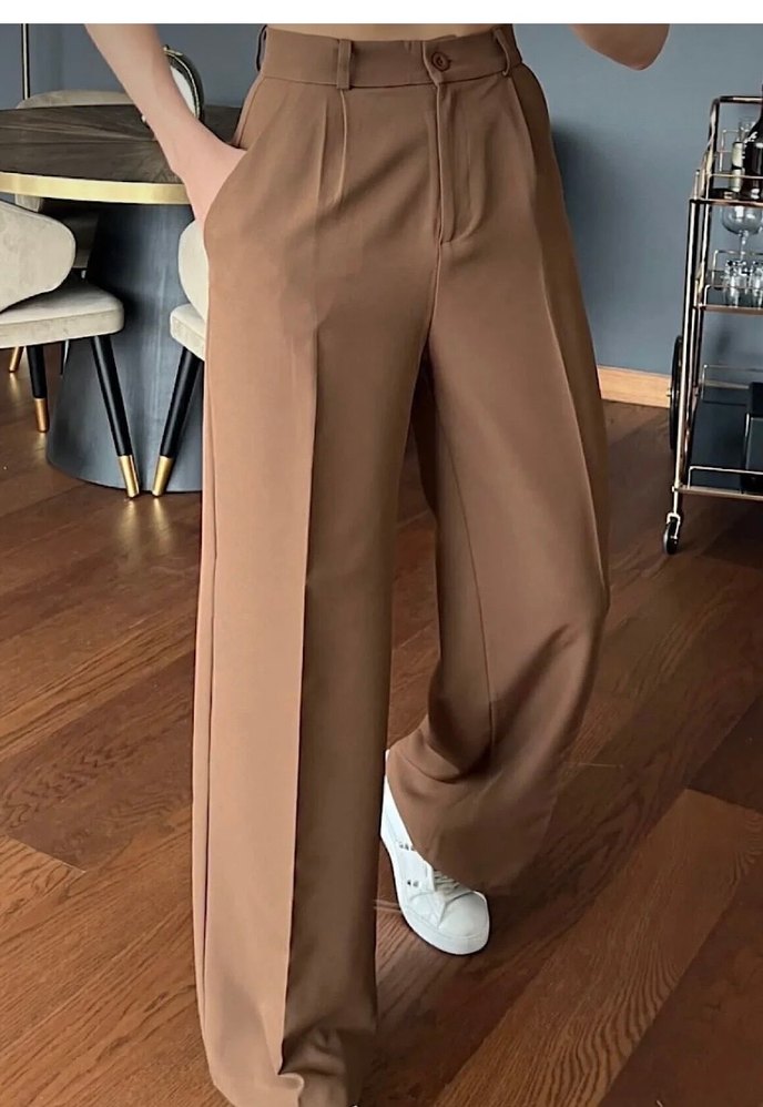 Kadın kahverengi midi pantolon, regular fit ve yumuşak sentetik kumaştan, minimalist sokak stili ve zahmetsiz şıklık sunar.