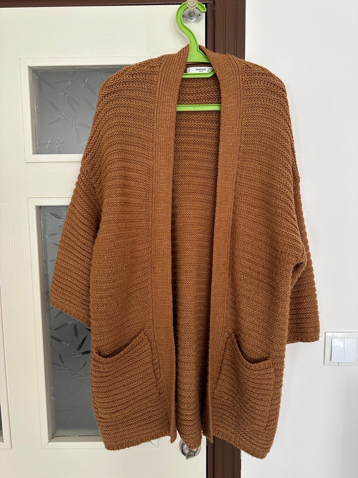 Kahverengi örgü hırka, bol kesim, 3/4 ve yakalıdır. Ürün xs beden fakat geniş kesim olduğu için ben m bedende kullandım l da rahat kullanır Midi boyda, cepli ve desensizdir. Günlük kullanıma uygundur.