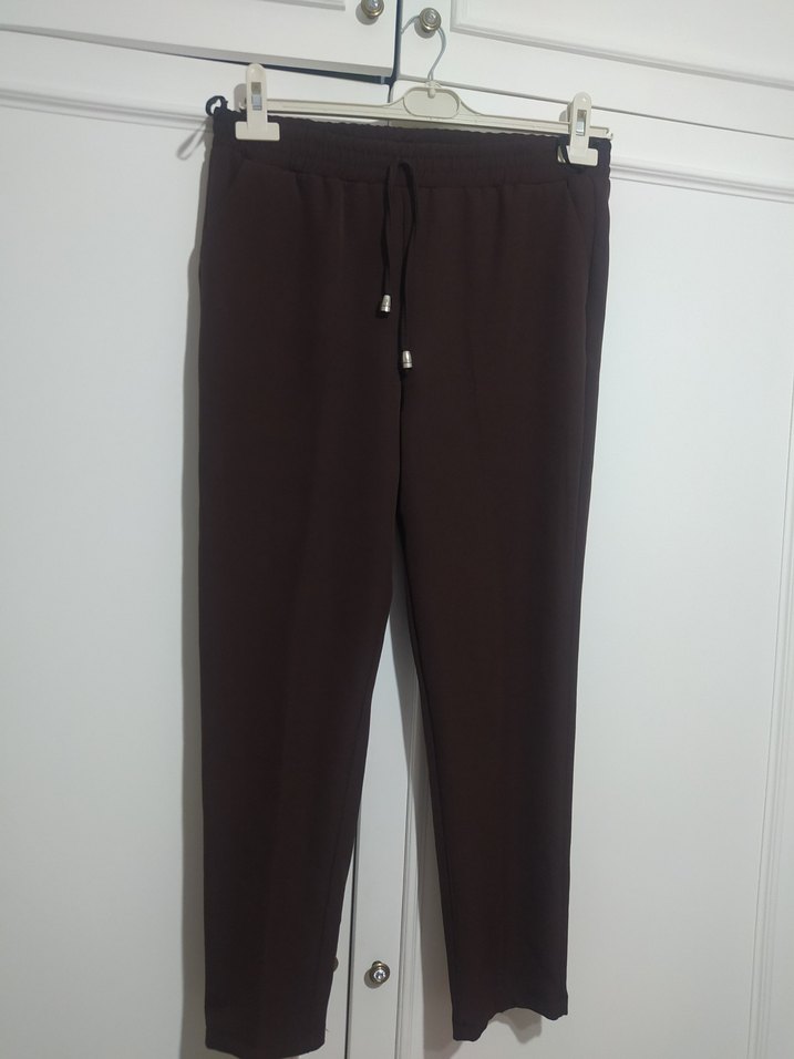 Kadınlar için kahverengi, midi boy, rahat kesim kumaş pantolon. Yumuşak sentetik kumaştan, gündelik kullanıma uygun sade ve şık tasarım.belli lastiklidir 38 40 bedene uyumlu