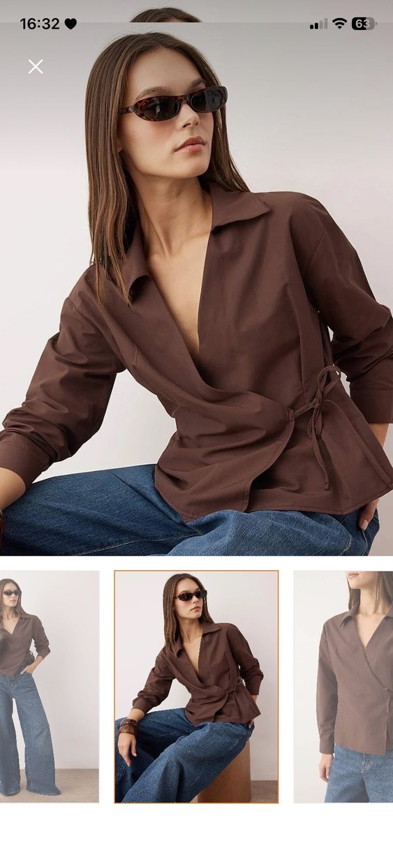 Kadınlar için kahverengi, ipeksi kumaştan, V yakalı, uzun kollu, düğmeli ve bol kesim gömlek. Günlük kullanıma uygundur.