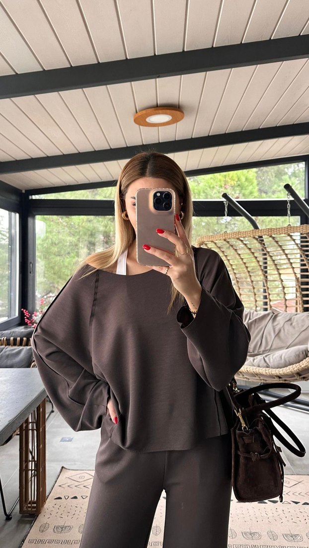 Kadın kahverengi mini eşofman takımı, uzun kollu ve bisiklet yaka, yumuşak sentetik kumaştan rahat sokak stili için.