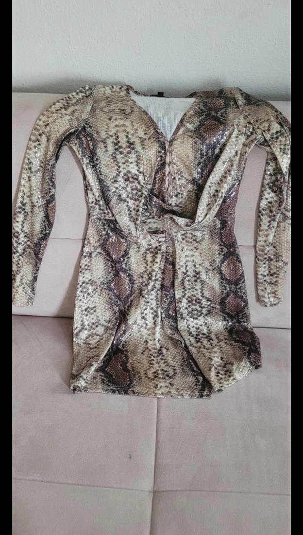 Kadınlar için yılan desenli, kahverengi tonlarında, uzun kollu, kısa ve mini boyda, vücuda oturan elbise. Modern ve rahat tarzda.