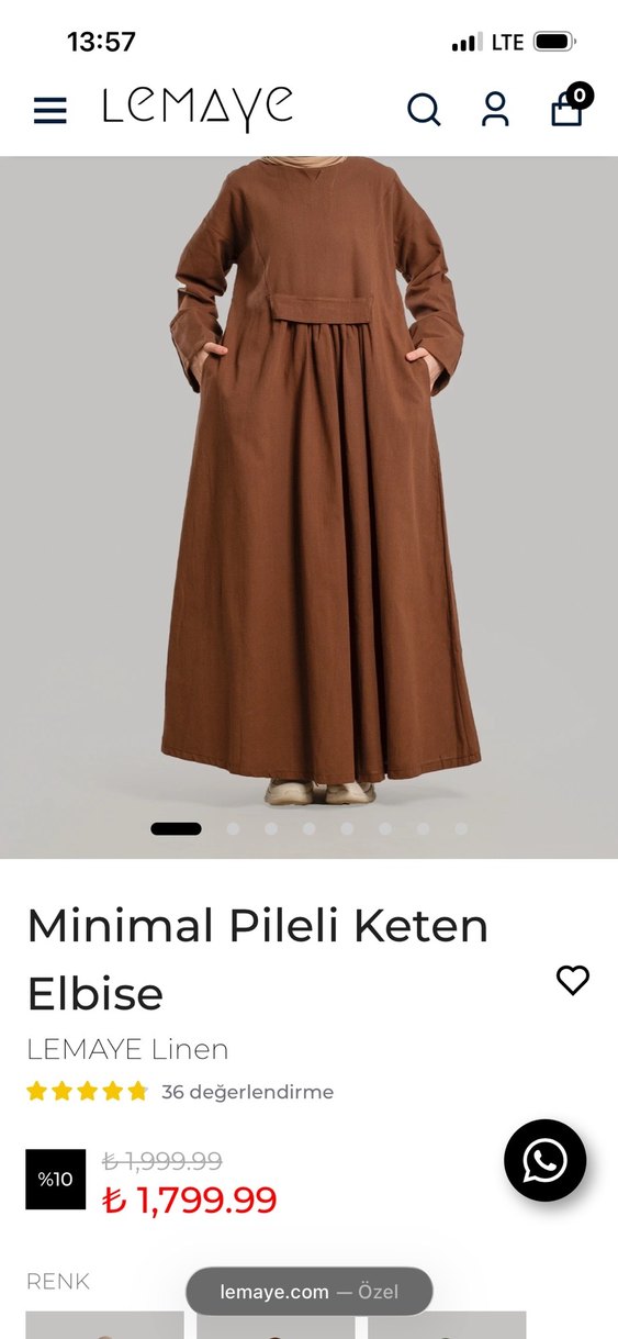 Sitedeki fiyatı gözüküyor ,ürün gelince bi kere yıkayıp öyle denediğim için,yıkanmadan dolayı iade almadılar .Hiç giymedim .Kahverengi keten uzun elbise, pileli ve bol kesimdir. İp askılı, yuvarlak yaka ve sade normcore tarzındadır. Günlük kullanıma uygundur.