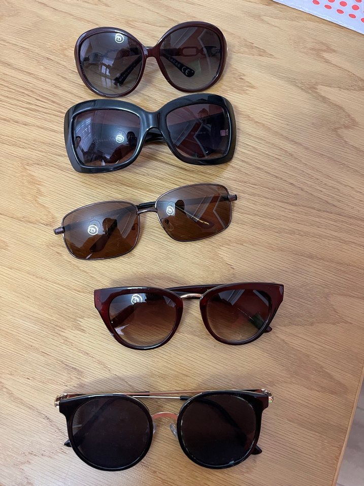 Koyu kahverengi tonlarda, minimalist ve karşı kültür tarzında beş adet kadın güneş gözlüğü seti. Her biri trend ve rahat şıklık sunar. 5 tane aralarında h&m mango olanlar vardır . Ancak vida gevşemesi ve vida düşmesi gibi ufak tefek problemleri var . Ama görmeye engel sorun oluşturmaz camlarda çizik vs yok .