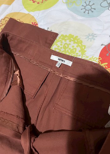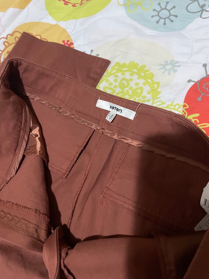Kadınlar için kahverengi kumaş pantolon, bol kesim ve fermuarlı. Nakışlı detaylar ve midi boy, ofis ve günlük sokak stiline uygun.