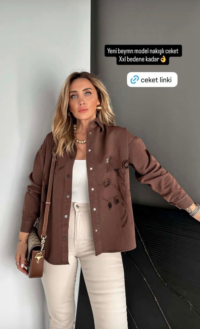 Kadın kahverengi deri ceket, uzun kollu, düğmeli ve nakışlıdır. Salaş kesim ve kısa boy ile günlük kullanıma uygundur. XXL bedene kadar mevcuttur.