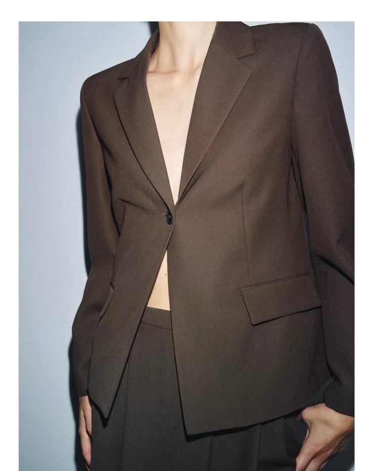 Kadın kahverengi blazer, notch yaka ve regular fit özellikli. Ofis için şık ve çağdaş, ipeksi dokulu, normal boy ve askılı kollu, desensiz tasarıma sahip.