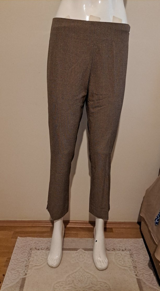 Kahverengi midi boy kumaş pantolon, regular fit ve desen içermeyen tasarımıyla ofis için uygundur. Sentetik kumaştan yapılmış, zahmetsiz şıklık sunar.
