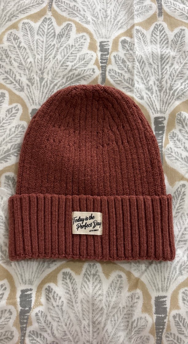 Kahverengi örgü bere, katlanabilir kenar ve 'Today is the Perfect Day' yazılı yama ile rahat ve şık bir görünüm sunar.