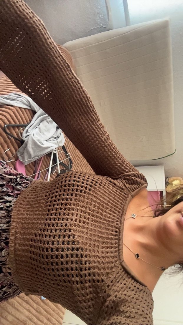 Fitted kesim kahverengi örgü triko, kayık yaka ve askılı kollara sahip. Yumuşak triko kumaştan, bohem tarzıyla günlük kullanıma uygun.