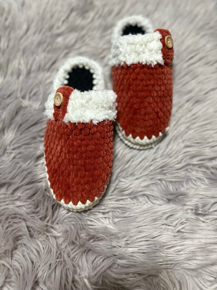 Yumuşak ve rahat dokulu kahverengi örme kadın ev terliği, kama topuklu ve düğme detayıyla bohem tarzda. Günlük kullanım için uygundur. 38no
