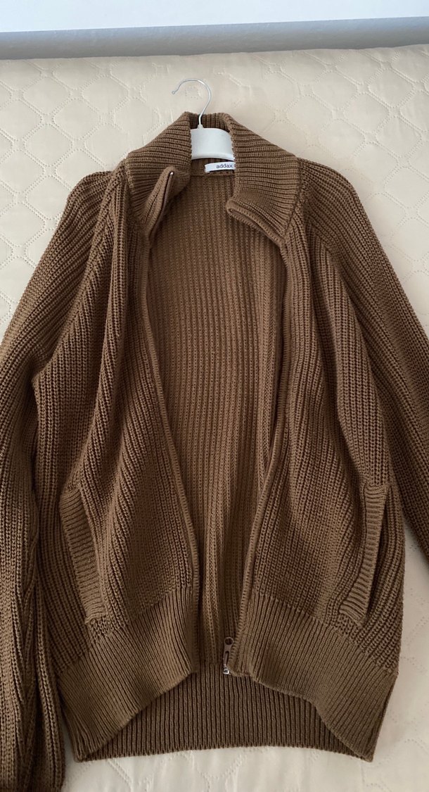 Bu kahverengi örgü hırka, yüksek yaka, uzun kollu ve bol kesime sahiptir. Yumuşak triko kumaştan yapılmış, desen içermeyen rahat bir tasarımdır.