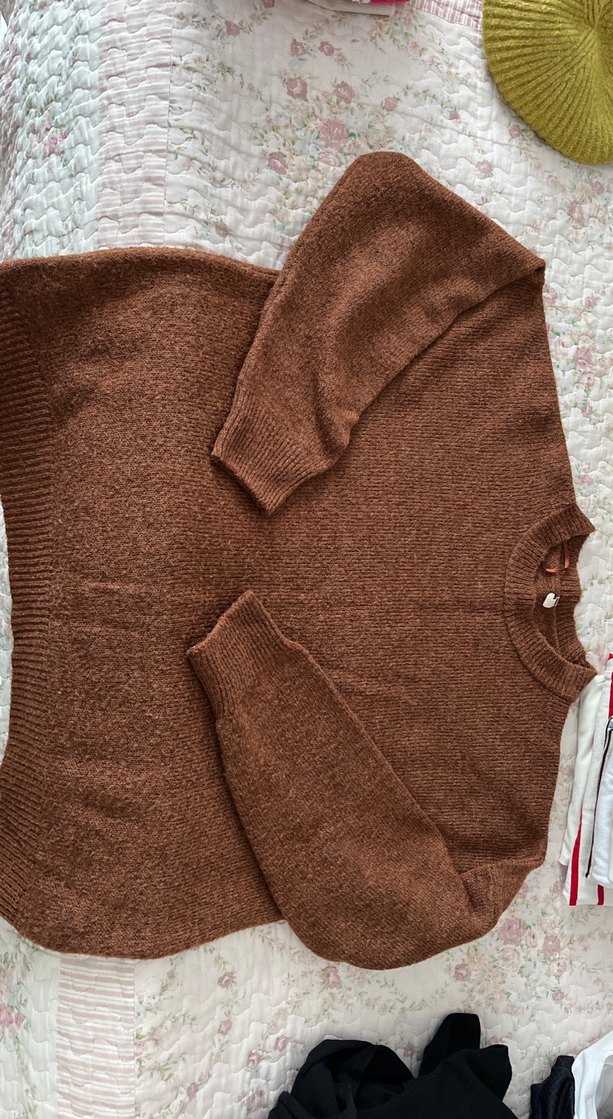 Kadın kahverengi örgü kazak, bol kesim ve uzun kollu. Yumuşak örme kumaştan, yuvarlak yaka ve normal boyda, rahat ve günlük kullanım için uygun.
