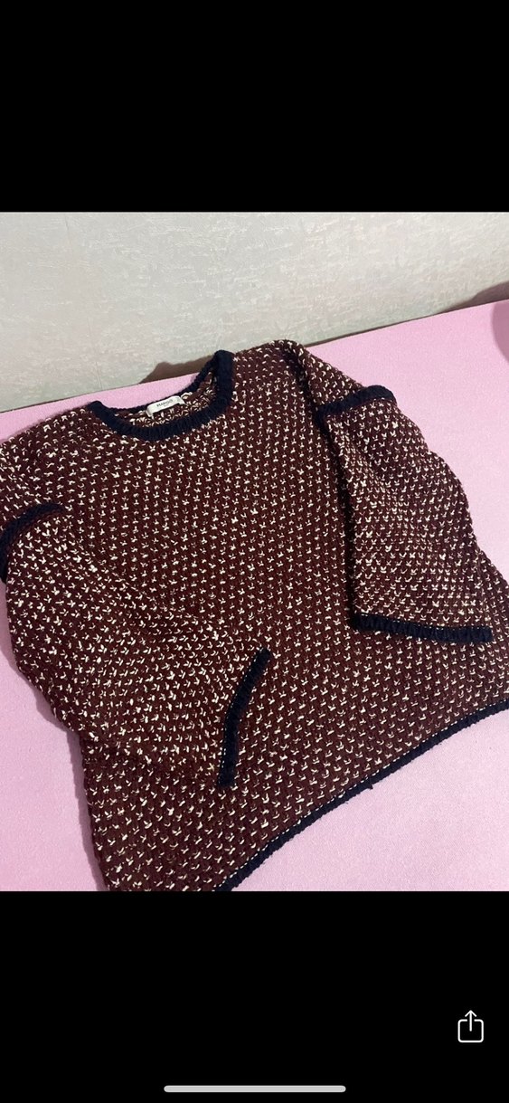 Kadınlar için koyu kahverengi, uzun kollu, yuvarlak yakalı, bol kesim örgü kazak. Rahat dokusu ve koyu renk kenar detaylarıyla günlük sokak stiline uygun.