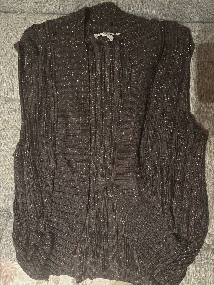 Kadın kahverengi, gri tonlu, yumuşak yün kumaştan örülmüş, kolsuz, bol kesim ve bisiklet yakalı midi hırka. Rahat ve bohem tarzda, günlük kullanıma uygun.
