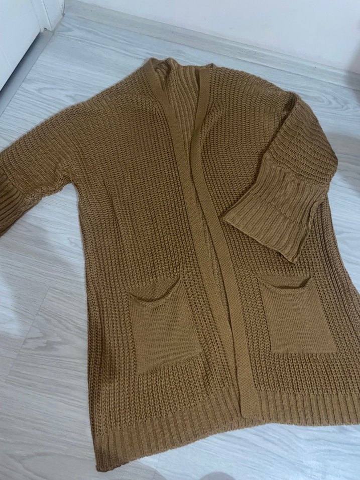 Bu kahverengi örgü hırka, rahat kesimi, uzun kolları ve boğazlı yaka ile günlük sokak stiline uygundur. Midi boyda ve ön ceplidir.