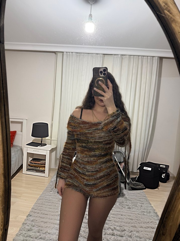 Fitted kahverengi örgü mini elbise, uzun kollu ve straplez yakalı, rahat tie-dye desenli bohem tarzda. Günlük kullanıma uygun. Ürün hiç kullanılmadı denemek amaçlı üzerime giyindim ev fotoğrafladım duruşu anlaşılsın diye shenden aldım ürün iadesi ile uğraşmayacağım için buraya koymayı tercih ettim bugün elime geçti çok beğenerek aldım fakat beden küçük oldu 167. Boy 63 kiloyum bedeni M fakat xs yada s bedene ancak olabilir kalıbı dar çünkü örgü kazak şort tulum kalitesi harika kendime büyük bedenini tekrar sipariş vereceğim alıcısına şimdiden hayırlı olsun