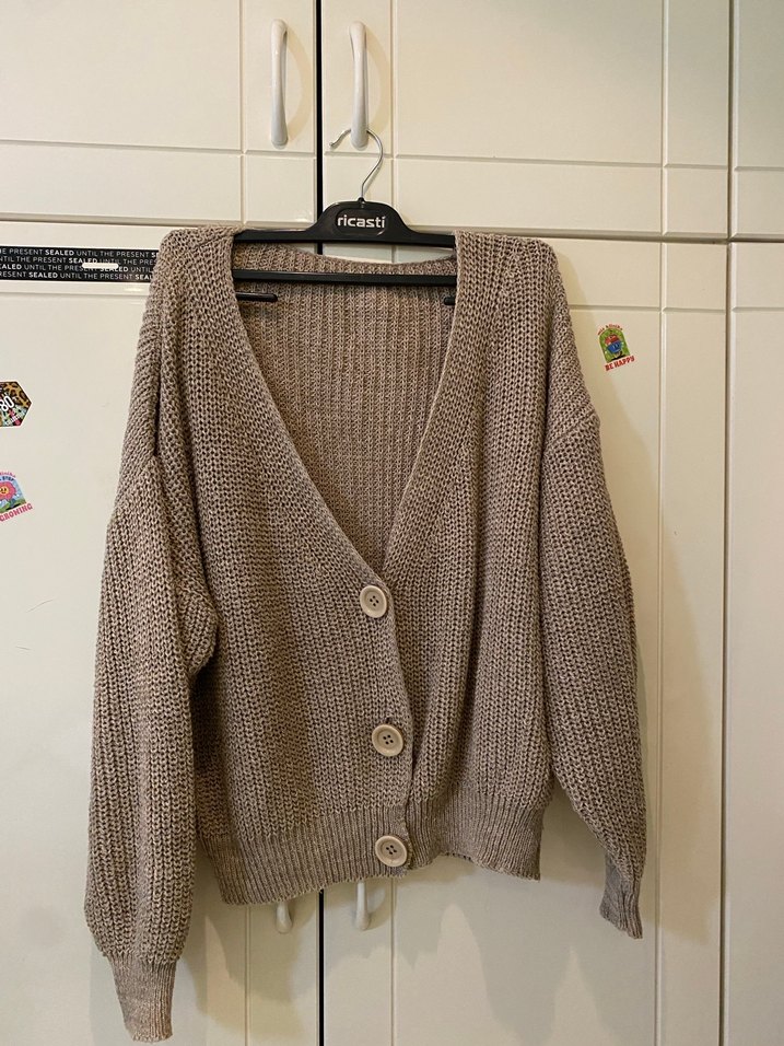 Kadınlar için, uzun kollu, salaş kesim, yuvarlak yaka, kahverengi örgü hırka. Orta uzunlukta ve desensiz, rahat günlük kullanım için uygundur.